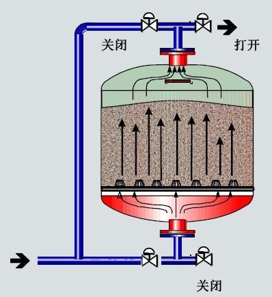 通常采用水反洗方式,從過濾器底(dǐ)部進水,水流速度(dù)是正常過濾速度的2-3倍,衝出過濾器內(nèi)填料表麵的泥沙、雜(zá)質。清洗幹淨後又可以繼續(xù)使(shǐ)用。清洗效果受(shòu)水流速度影(yǐng)響(xiǎng)很大(dà),且要反複正洗、反洗才能達到預期效果,清洗的時間較長。